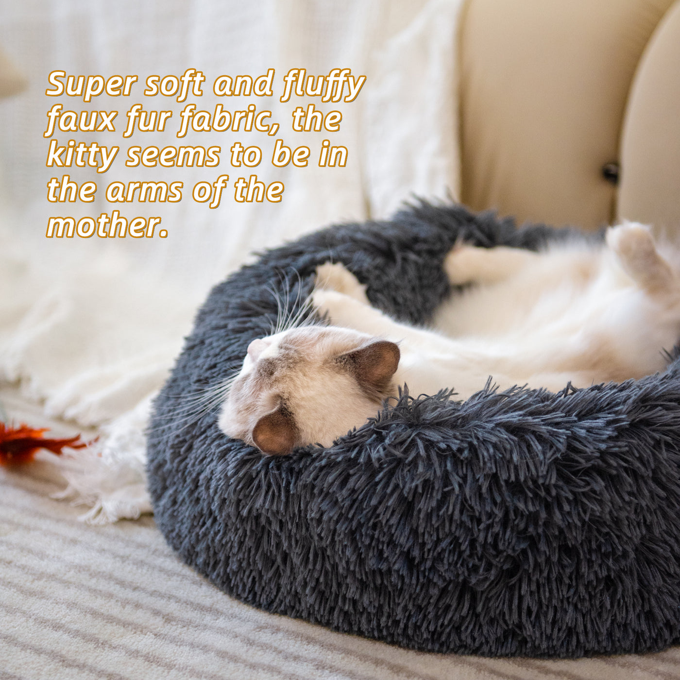 Convenient: The non-slip pet donut bed is surrounded by soft fabric and it is fluffy and soft to the touch.It is convenient to put in your carpet, couches, sofas, chairs, beds, floors and cars.